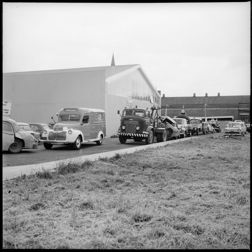 [LIne of tow trucks towing wrecked cars parked (before or after) parade]