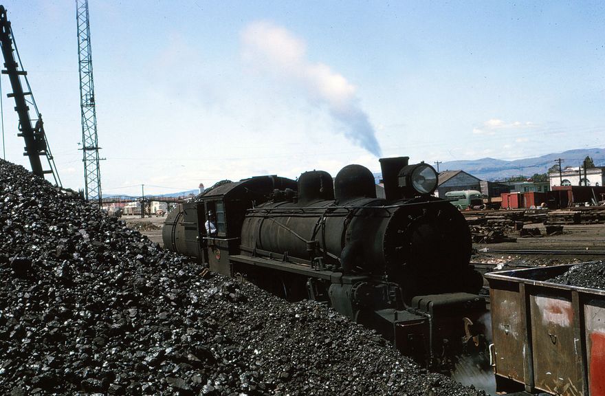 AB class engine 737 next to a coal pile in the Palmerston North railway yards.
