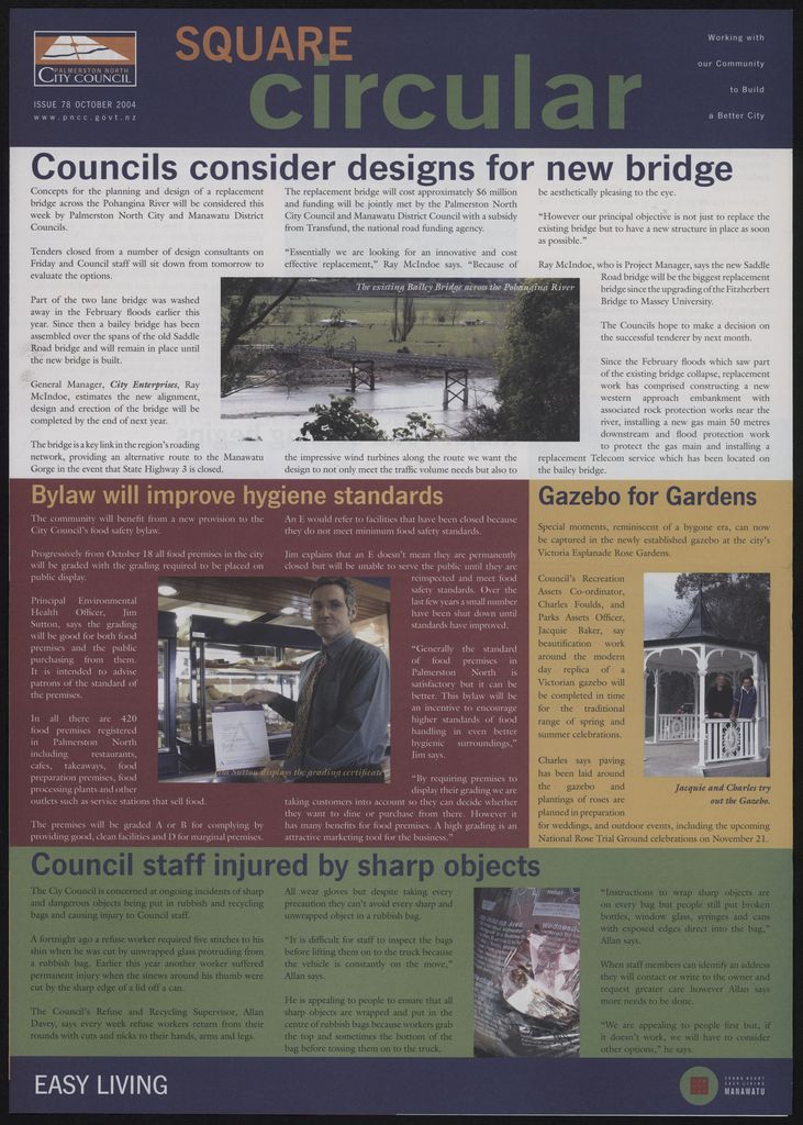 The Square Circular was Palmerston North City Council's monthly community publication, informing Palmerstonians of PNCC initiatives, activites, and events. This month's issue includes: City Heart; The Square; Bio commerce centre; The Stomach; library; Te Manawa; Pohangina river bridge; roading; trees; The Esplanade; food safety bylaw; bylaws; waste management; recycling; civil defence; community groups grants; elections.