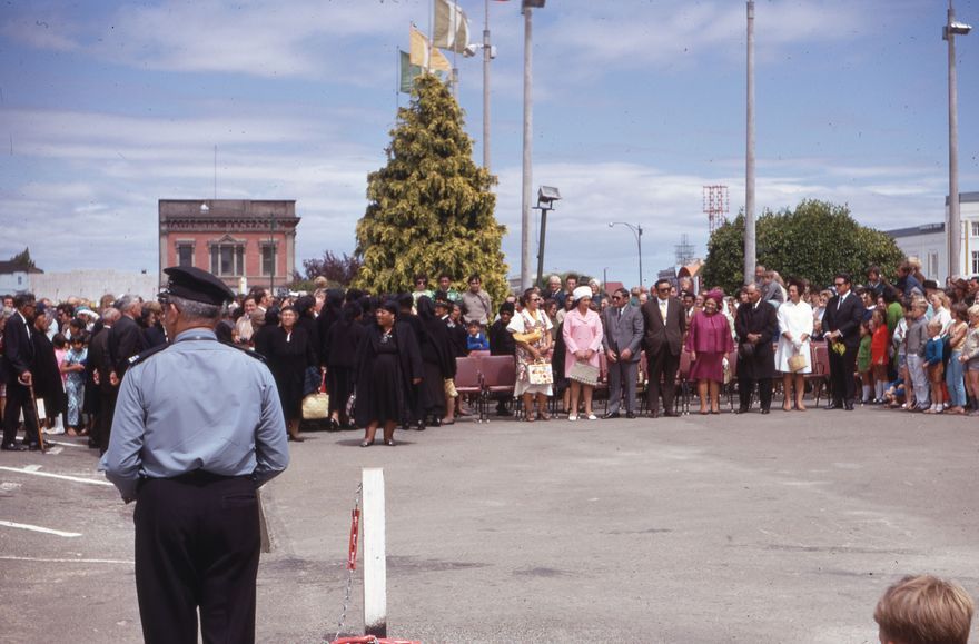 Māori leadership address the crowds in the Square, as part of the official Centenary ceremonies. Koro Wētere, MP for Western Māori is visible in the light gray suit, standing next to a lady in pink.