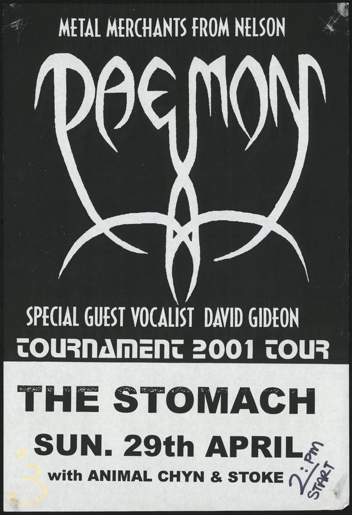 Metal merchants from Nelson. Daemon. Special guest vocalist David Gideon. Tournament 2001 tour. The Stomach. Sun. 29th April. With Animal Chyn & Stoke.