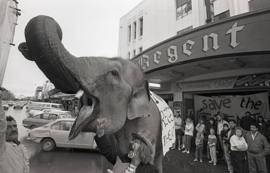 This image was taken for a story that ran in The Manawatu Evening Standard on 15 May 1989 with the caption : "Sole Brothers' Circus' Minyak rallies for the cause outside the Regent Theatre on Saturday." Minyak wore banners with slogans aimed at convincing passers-by to sign a petition to save the Regent Theatre from demolition. 1500 people signed the petition during the stunt.