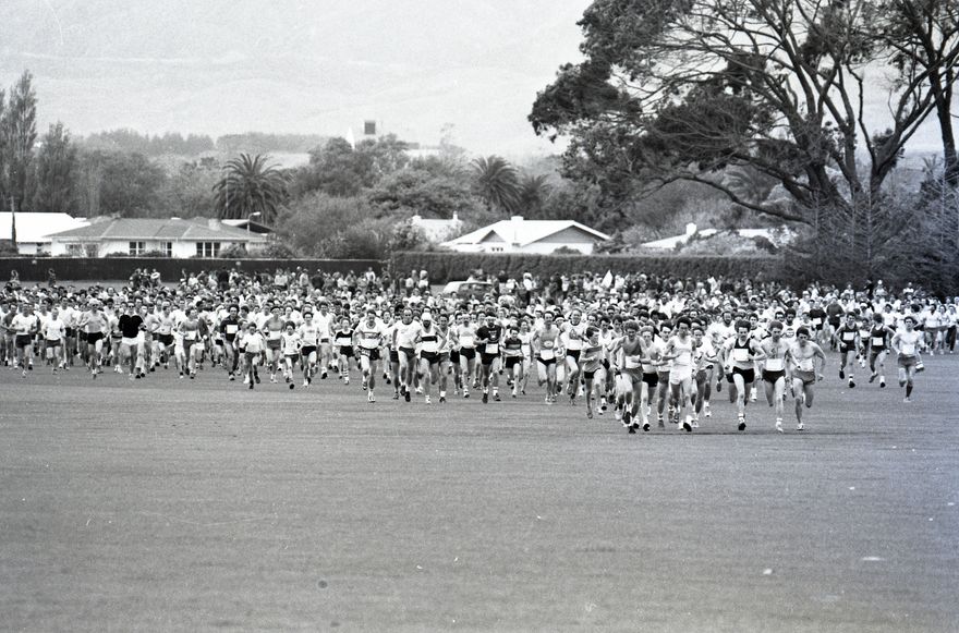 This image was taken for a story and photo feature that ran in The Manawatu Evening Standard on Monday 8th October 1988. "Fun run fans fired up: A flock of flying feet heads across Ongley Park at the start of the run for fun."