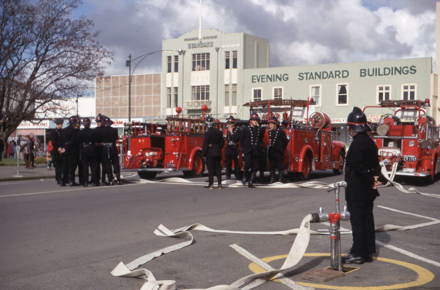Three older fire engines are parked across the road in front of the Grand Hotel, with the Evening Standard Buildings visible behind. The group of firemen appear relaxed, so it may be part of a parade or display of machines, rather than an actual fire.