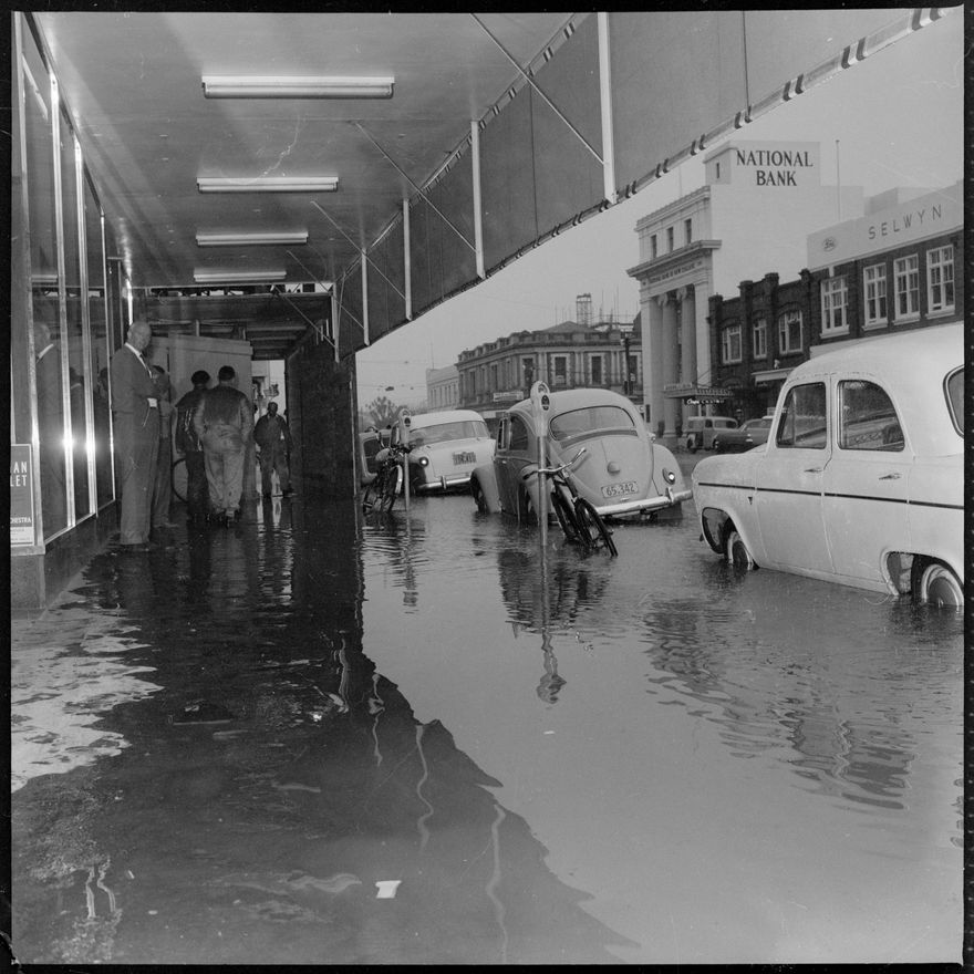 This image was not published in the Manawatu Evening Standard, taken on 9 July, 1963. "Floodwaters, caused by the torrential rain late this morning, caused much inconvenience today in many parts of the city. With school-children on their way home for lunch, many had difficulty in getting to their homes. Pedestrians found it almost impossible to walk along the footpath between the Square on the Bank of New Zealand side of the street. Water lapped from shops fronts to the centre of the road." Other images of the flooding were published on 9 July, 1963.