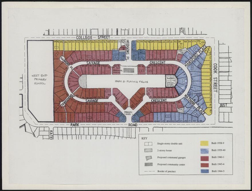 Savage Crescent is in the West End area of Palmerston North, bounded by College Street, Cook Street and Park Road. Fifty acres was bought by the Government for the development, and between then and 1944, 245 state houses were built. For the time, Savage Crescent was designed upon the most modern ideas, as a garden suburb, with a large central, recreational area, communal garages and a variety of house designs built for the sun and with ample gardens. While the majority of the houses in Savage Crescent are now privately owned, the precinct remains as a significant example of state housing in New Zealand.