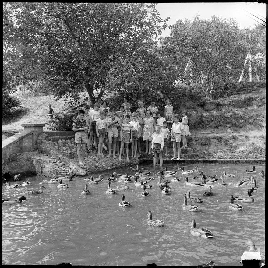 This image was taken for a story that ran in The Manawatu Evening Standard on 21st March, 1963. "St. Mary's School children had their picnic at Memorial Park yesterday. Here they are seen feeding the ducks."