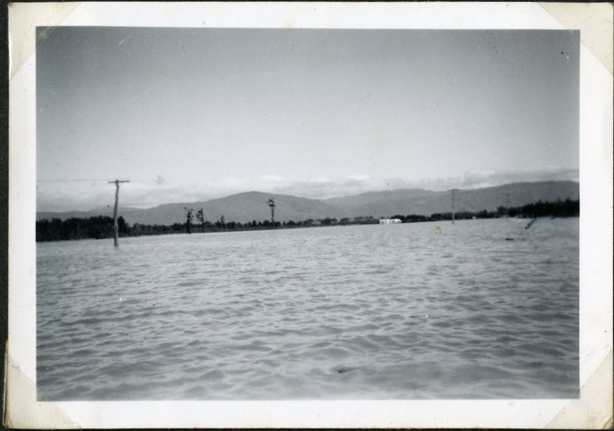 The 1953 flooding of the Manawatu and Oroua River was one of the worst on record for the area. This photograph shows the house belonging to Norm Terry flooded, taken from the Main Road.
