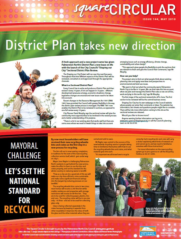 The Square Circular was Palmerston North City Council's monthly community publication, informing Palmerstonians of PNCC initiatives, activites, and events. This month's issue includes: District Plan; Recycling; Lido; Linklater Reserve; Community Centres; Emergency Plan; Convention Centre; Events; Jazz and Blues Festival; Funding