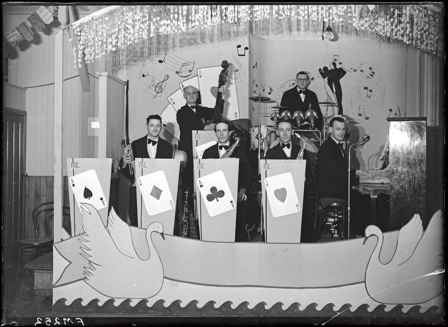 In 1940s Palmerston North, dance bands were in demand to play Saturday night halls, clubs and special occasions. Mel Creighton’s band, named The Aces, is set to play at one such venue, perhaps the ANA Dance Hall (later the Astoria Ballroom) in George Street. The band played many such halls, such as the old Oddfellows Hall in Cuba Street, A&P Hall at the Showgrounds. They also were popular for country dances in smaller towns like Opiki, Rongotea and Rangiotu. The named members of the band were: Mel Creighton (piano), Jack Creighton (double bass, father of Mel), Jeff Everson (drums), Syd Wood on trumpet, Andy Keen on saxophone. Their signature card themed decorations appear with them in this photograph.