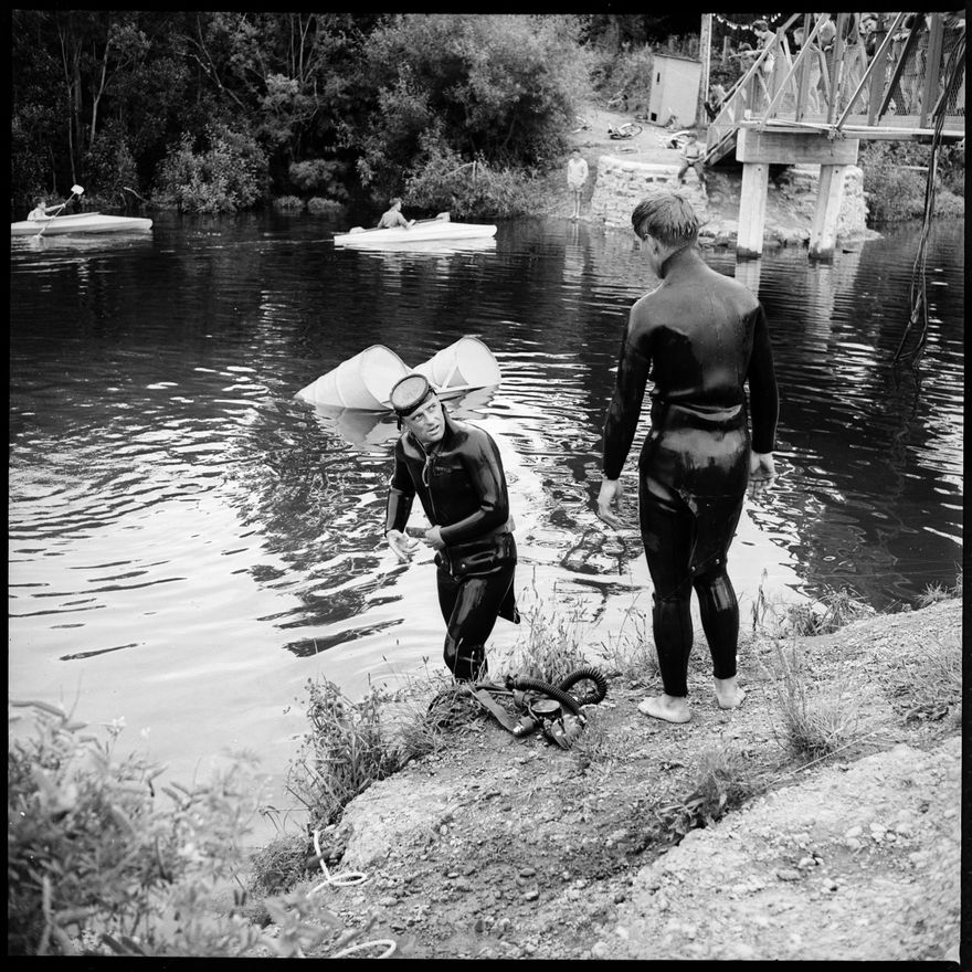 This image was not taken published in The Manawatu Evening Standard, taken on 18 January, 1964. [Royal New Zealand divers test equipment at Centennial Lake for the Palmerston North Carnival of the Lake." See also: 2017N_2017-20_018311, 2017N_2017-20_018312, 2017N_2017-20_018314. 2017N_2017-20_018310 was published on 18 January, 1964.