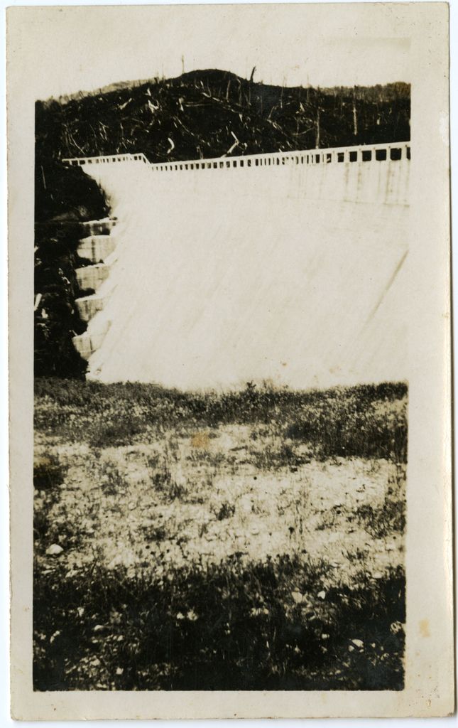 This photograph came from a small photograph album that belonged to Mrs R Andrews of Rangitikei House. This photograph bears the caption, "View of dam, Mangahao Hydroelectric Works." The Managhao Dam, completed in 1924, is situated inland of Shannon, and continues to supply electricity to a wide area today.
