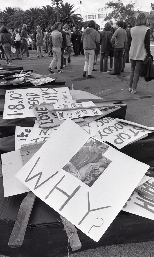 "More than 200 anti-Vietnam war demonstrators marched quietly and solemnly along Broadway Avenue in Palmerston North shortly after noon yesterday, carrying a dozen black-draped coffins designed to symbolise the 28 New Zealanders killed in the Vietnam War.