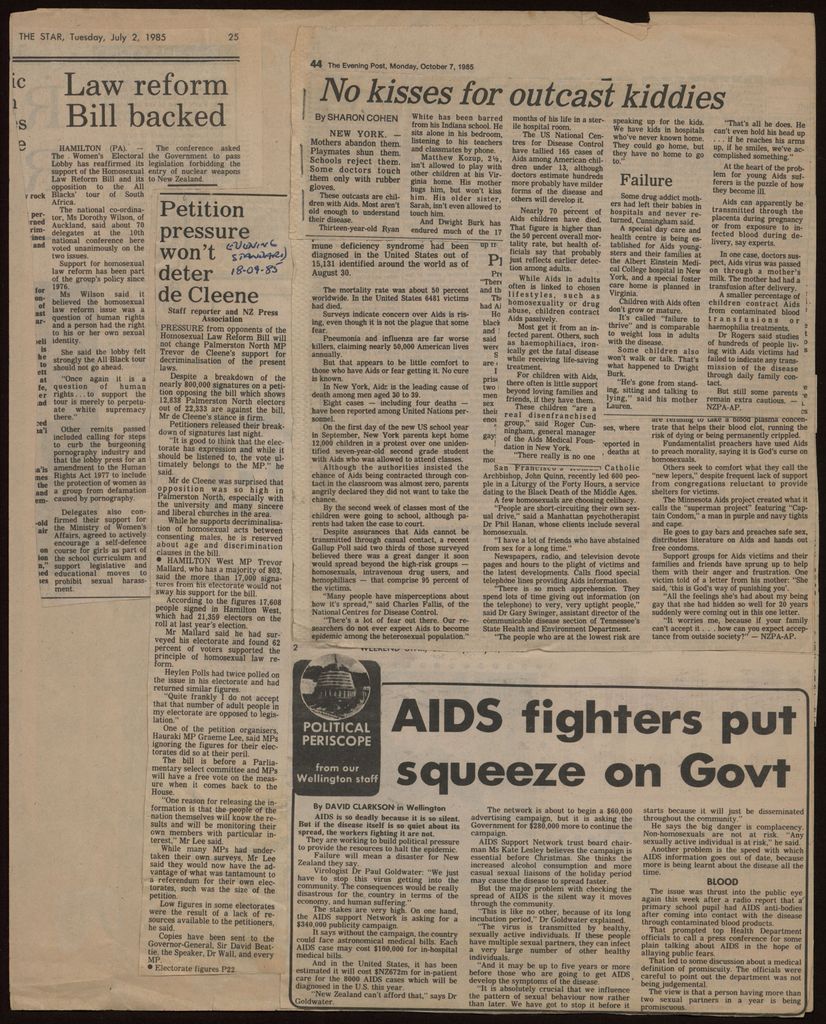 Consisting primarily of clippings from New Zealand newspapers, it covers the subjects of Homosexual Law Reform efforts, the Aids epidemic and New Zealand gay and lesbian rights movements.