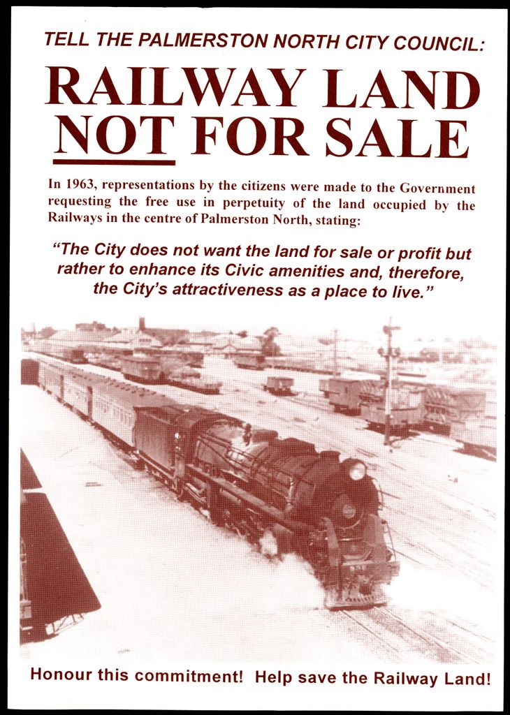 A flier created by the Railway Land Action Group opposing the Palmerston North City Council's sale of the Railway Land.