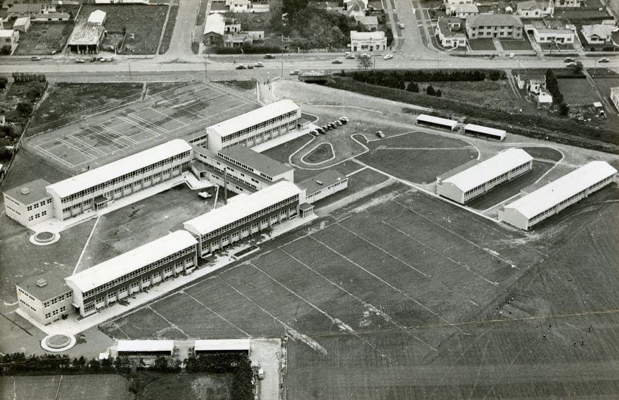 Queen Elizabeth College was originally sited in King Street, as the Palmerston North Technical College. A new college was built in Rangitikei Street in 1956, and by the 1960s it was the second largest educational establishment in Palmerston North, after Massey University, with a population of over 900 secondary school pupils and over two thousand on the tertiary roll. Over the years the college has continued to provide tertiary technical education and hobby classes. This photograph was taken on the occasion of the 50th Jubilee on the 19 – 22 October 1956.