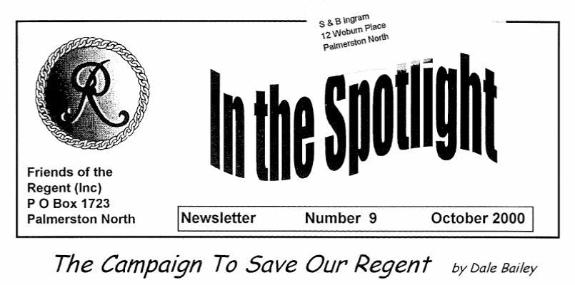 - The nineth newsletter of the Friends of the Regent, featuring a history of saving the Regent, Annual Report and profiles of committee members. - The Regent Theatre in Broadway, opened 4 July 1930 as a cinema and theatre. It was designed by Charles Hollingshed for owners Williamson Films Ltd, and built of reinforced concrete by Julian and Co at a cost of £46,000. One of its features is a solid marble staircase. In the 1990s the theatre was purchased by the Palmerston North City Council and restored as the city's premier theatre. It is leased to the Regent Theatre Trust Board who run the facility.