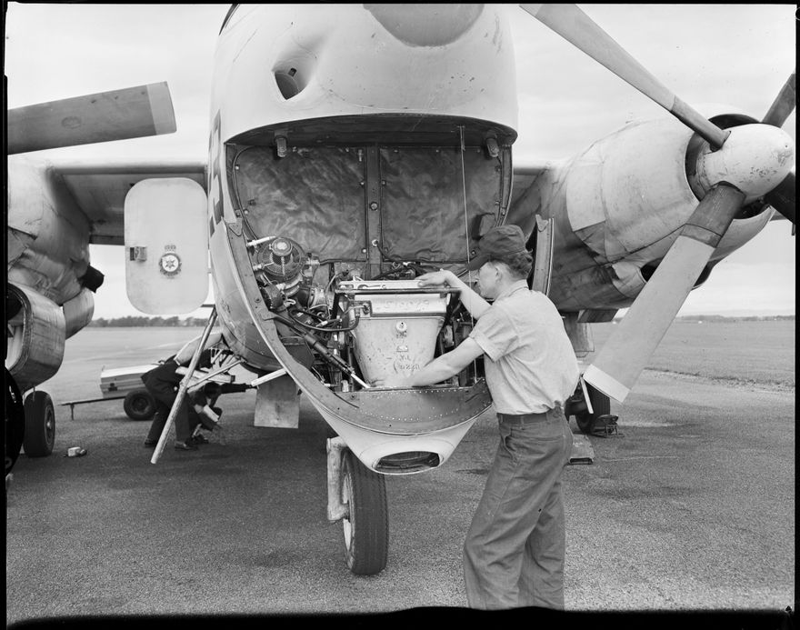 This image was taken for a story that ran in The Manawatu Evening Standard on 19 December, 1959. “Installed in the nose of the United States Navy Savage aircraft recently based at Ohakea was this large aerial camera used for taking oblique photographs. The nose of the aircraft is hinged to permit servicing of the camera.”