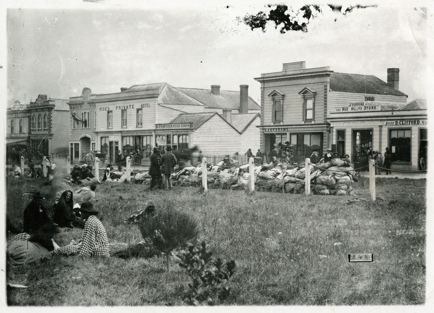 Ko ngā tangata i te Tapawhā o Te Papaiōea i te wā nui mō te Kōti ture whenua. Kei te whakaatu tēnei whakaahua i ngā peke kai. People gathered in The Square at the time of the ‘Native Land Court’.