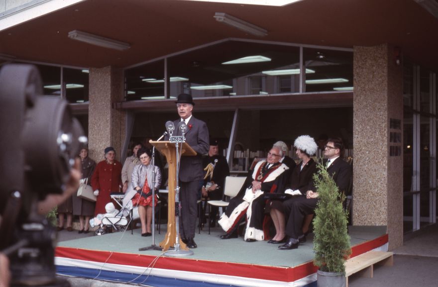 Governor General Sir Bernard Fergusson addresses the crowd at the opening of the Palmerston North Public Library. The three-storey library building was opened on 4 November 1965 and served as the city's library until 1996. Behind him can be seen the Mayor (Mr. G.M. Rennie) and other official guests who are seated on a raised platform outside the Public Library.