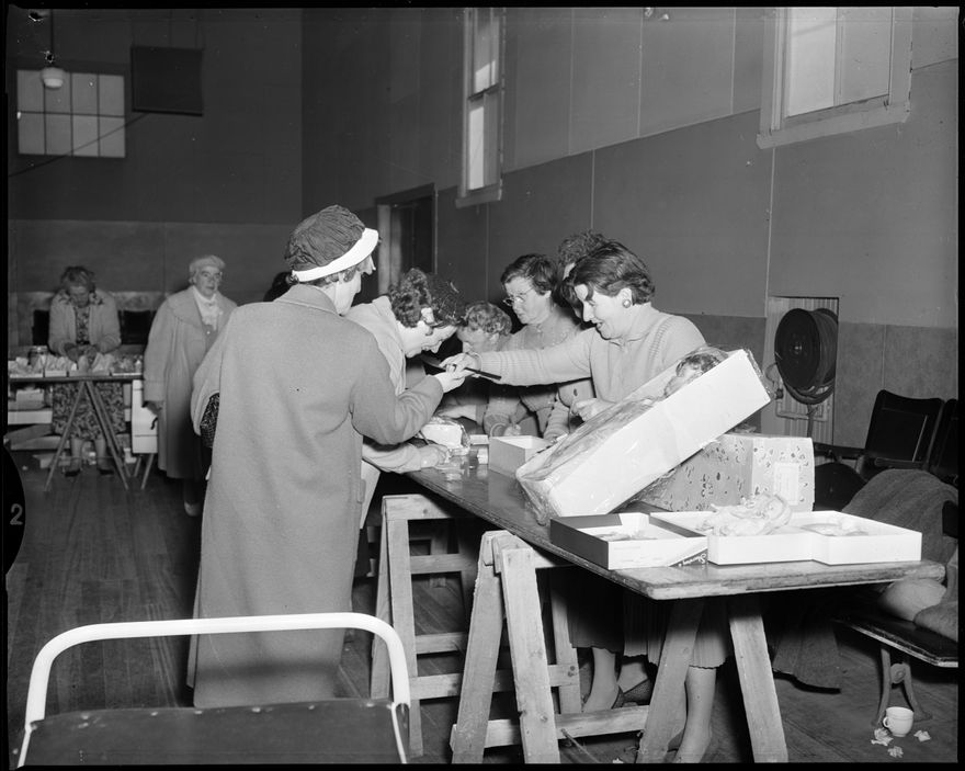 This image was taken for a story that ran in The Manawatu Evening Standard on 09 September 1960 "There was a friendly business atmosphere at the bazaar at the Astoria Ballroom in aid of school funds by Our Lady of Lourdes Parents' Association today. This photograph shows some of those engages in the task."
