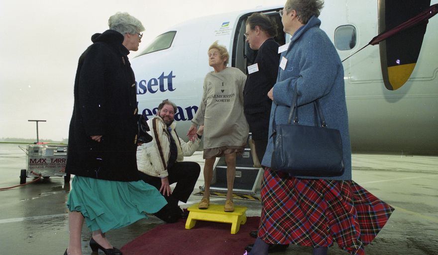 Emily remained in character for her seven-hour visit, where a 'Madge' company bus acted as her chauffer between the children’s ward at the hospital and a public reception outside Downtown in Broadway. The Rescue Helicopter then took her out to Linton Military Camp where she christened and Armoured Personnel Carrier (APC) bound for Bosnia with the name ‘Madge’. Finally, a visit to the residence of Brightwater Home was capped off with Emily pressing her hands into a square of concrete which was to go on display in Broadway.