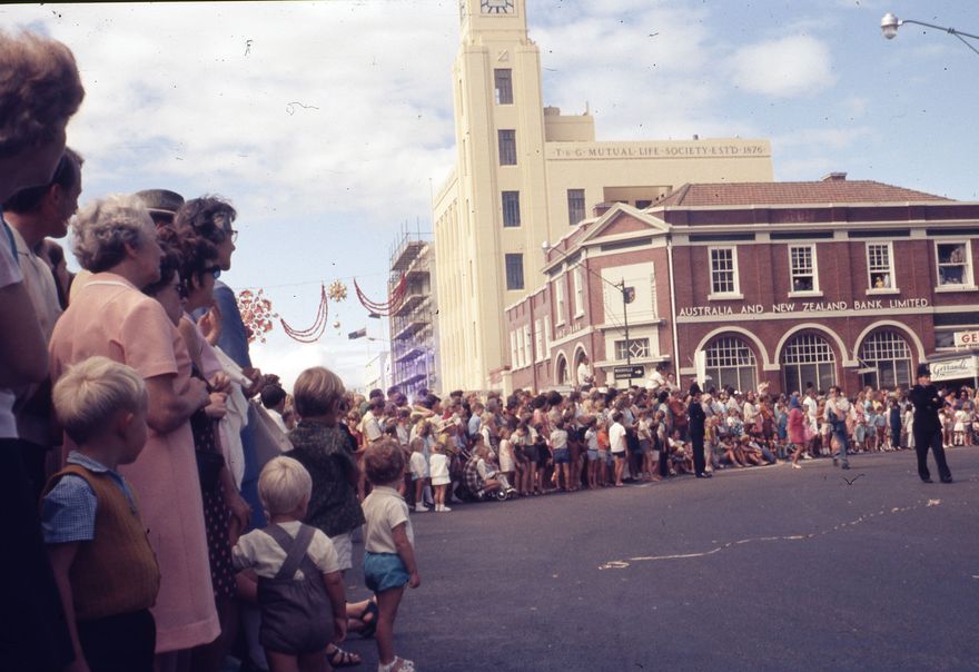 The crowd watching the Centennial Parade from the corner of Broadway Avenue and The Square. 92 floats took part at the Palmerston North City Centennial celebrations of 1971. Approx. 10,000 people were present at the event to celebrate 100 years of Palmerston North.