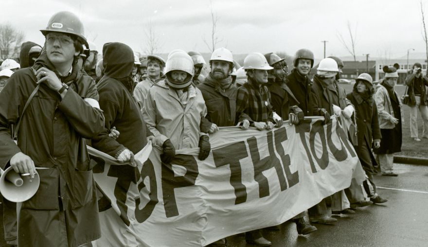 This image was taken for a story that ran in The Manawatu Evening Standard on 01 August 1981, with the caption: "Marchers in the vanguard of today’s protest were well protected with hard helmets and heavy clothing.” COST (Citizen's Opposed to the Springbok Tour) marshal Alick Shaw, holds the megaphone.