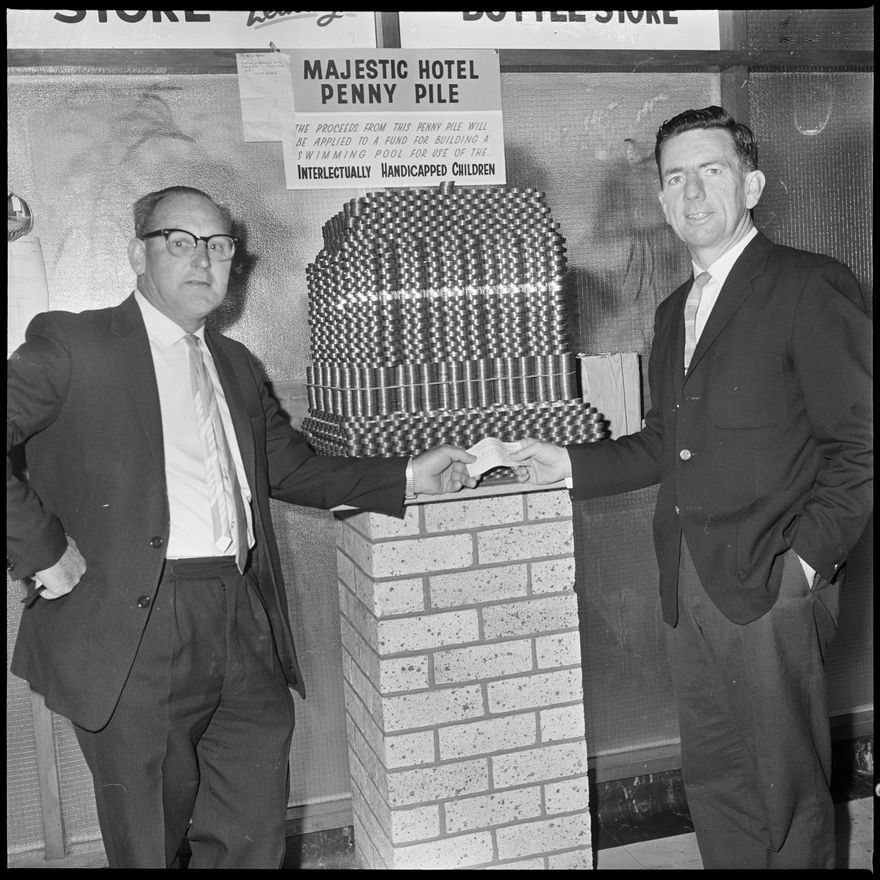 This image was taken for a story that ran in The Manawatu Evening Standard on 3rd January 1966 "The penny pile being built by a group of volunteers at the Majestic Hotel received a final boost on New Year's Eve. With several donations from well-wishers during the Christmas period, sent to the chairman of the Manawatu Committee for Intellectually Handicapped Children (Mr. K. Williamson, right) he handed to the hotel penny-pile organiser (Mr. C. Sydow, left) a cheque to swell the fund to £425. A further £15 was donated in notes. The final target of £600 is now well in sight, and it is hoped by organisers that the demolition of the pile can be undertaken early in the New Year."