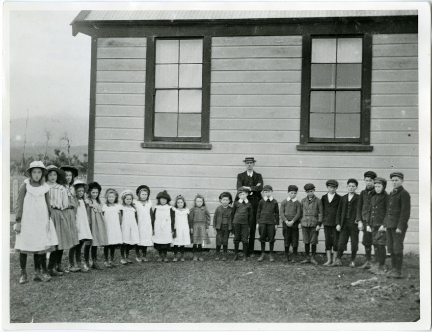 Left to right: Norah Callesen, Annie Millen, Eileen Lynch, Kate Henson, Agnes Spelman, Kathleen (Gay) Spelman, Adelia (Delia) Spelman, Olive Hunt, Mary Leamy, Eileen Spelman, Mary Wellock, Albery Henson, Oscar (Tui) Callesen, Bernard Spelman, Unknown (Delph Spelman?), Tom Leamy, Cliff Spelman, Unknown x2, Henry Hunt. Teacher: Mr Lewis.