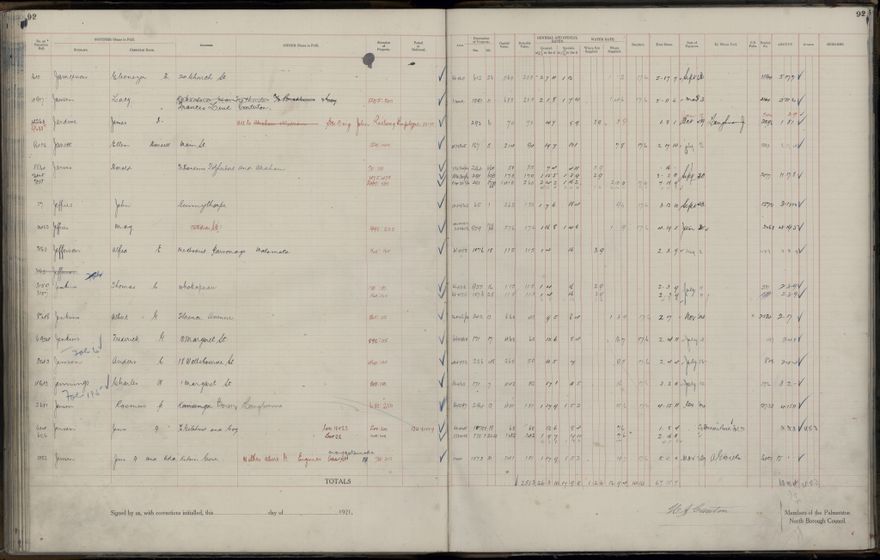 Palmerston North Borough Council rate book, listing rate payers for the years (1 April - 31 March) 1921 - 1922. Gives names, street, owner (if different to rate payer), legal description of property, capital and unimproved values and rates paid.