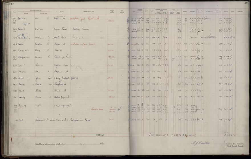 Palmerston North Borough Council rate book, listing rate payers for the years (1 April - 31 March) 1921 - 1922. Gives names, street, owner (if different to rate payer), legal description of property, capital and unimproved values and rates paid.