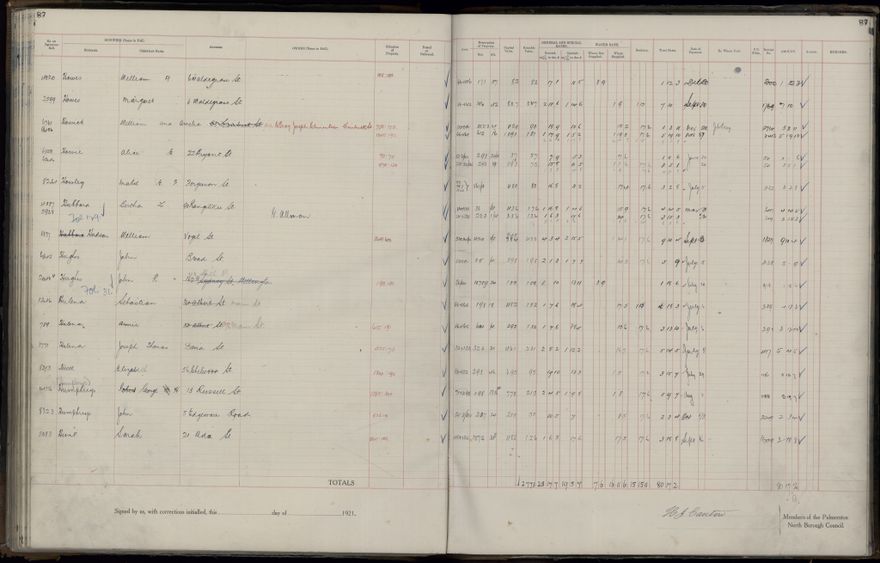 Palmerston North Borough Council rate book, listing rate payers for the years (1 April - 31 March) 1921 - 1922. Gives names, street, owner (if different to rate payer), legal description of property, capital and unimproved values and rates paid.
