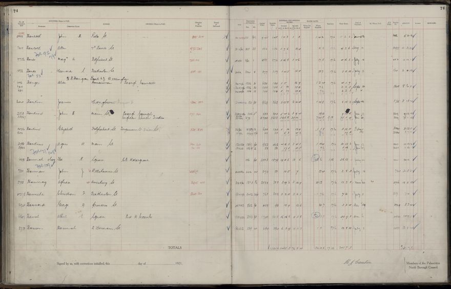 Palmerston North Borough Council rate book, listing rate payers for the years (1 April - 31 March) 1921 - 1922. Gives names, street, owner (if different to rate payer), legal description of property, capital and unimproved values and rates paid.