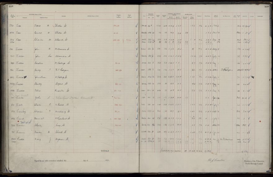 Palmerston North Borough Council rate book, listing rate payers for the years (1 April - 31 March) 1921 - 1922. Gives names, street, owner (if different to rate payer), legal description of property, capital and unimproved values and rates paid.