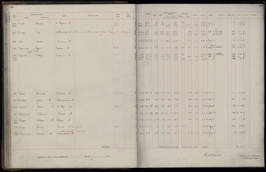 Palmerston North Borough Council rate book, listing rate payers for the years (1 April - 31 March) 1921 - 1922. Gives names, street, owner (if different to rate payer), legal description of property, capital and unimproved values and rates paid.