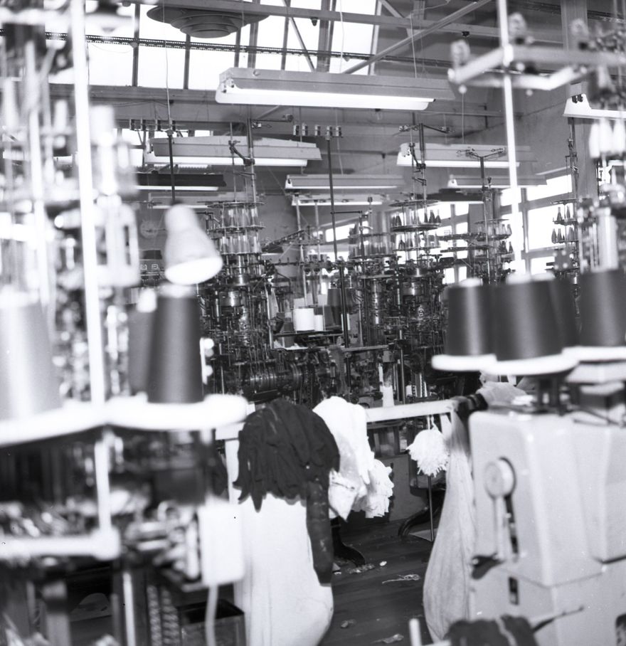 This photograph shows the interior of Jacquard Hosiery Mills Limited, including a close up shot of the sewing and knitting machines. Published in the Manawatu Evening Standard 12 February 1968 In the 1967 Palmerston North phone book the factory is listed as Jacquard Hosiery Mills Limited at 601 Featherston Street. Personnel included General Manager V Kraak, Manager W.V. Hobbs and Secretary M F Ryder.