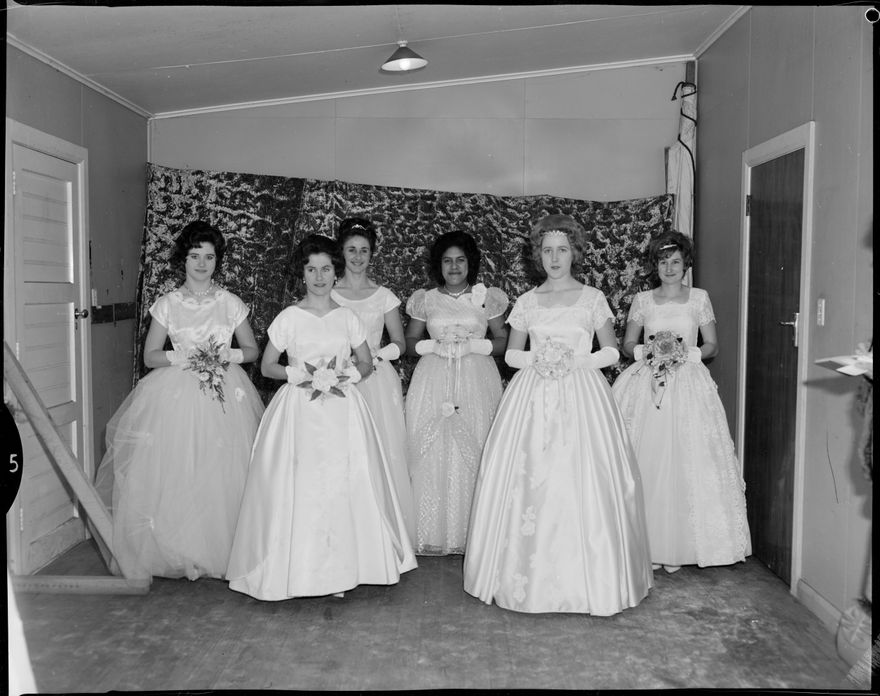 This image was taken for a story that ran in The Manawatu Evening Standard on 27 June, 1963. "Twenty-two debutantes were presented at the Charity Ball in Palmerston North last night. They were--Top photograph (from the left), Misses Lois McKay, Gabrielle Barnao, Delia Robinson, Carol Savage; front row, Misses Dianne O'Brien, Rita Nicholson, Carol McKenzie, and Ann Towers. Centre: Back row, Misses Catherine Reynolds, Barbara Parrott, Aileen Cammock, Annabelle Roache; front row, Misses Dianne Ongley, Lesley Hogg, Aileen Shaw and Judith Pyne. Lower: Back row, Misses Rosemary Creed, Mary Spellman, Dianna Williams, Janice Buckley; front row, Misses Rosaleen O'Hagan and Judith Whyte." Photo here is the bottom one.