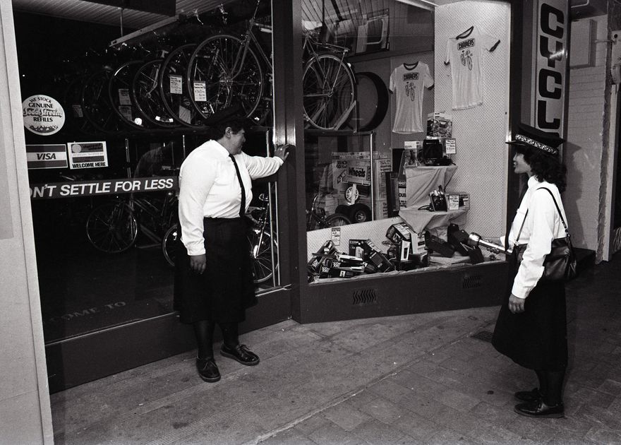 Māori Warden Carol Hall is on the left. This image was taken as part a feature that ran in the Manawatu Evening Standard on January 17 1987 about the work of Māori Wardens in Marton. According to the story that accompanied the photographs, Māori Wardens were instituted in 1937 and by 1987 there were 2300 working voluntarily throughout in New Zealand under the jurisdiction of the Māori Wardens' Association. Before receiving their badges and warrants, trainee wardens underwent an 18 month probationary period, taking training from senior wardens and the district wardens' associations.