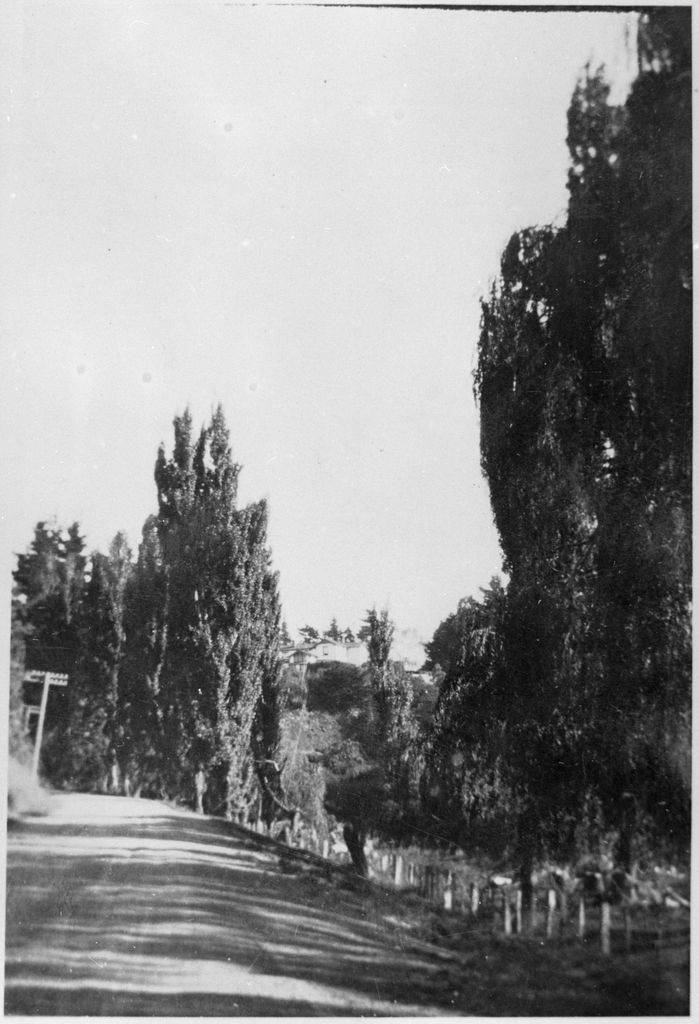 The photograph is taken at the foot of Fitzherbert Terrace and looks south towards Monro's Hill. Mr C J Monro's large homestead "Craiglockhart" can be seen on the edge of the terrace in the centre of the photograph. Today this road is a section of Highway 57. Craiglockhart is now Moginie Hall.