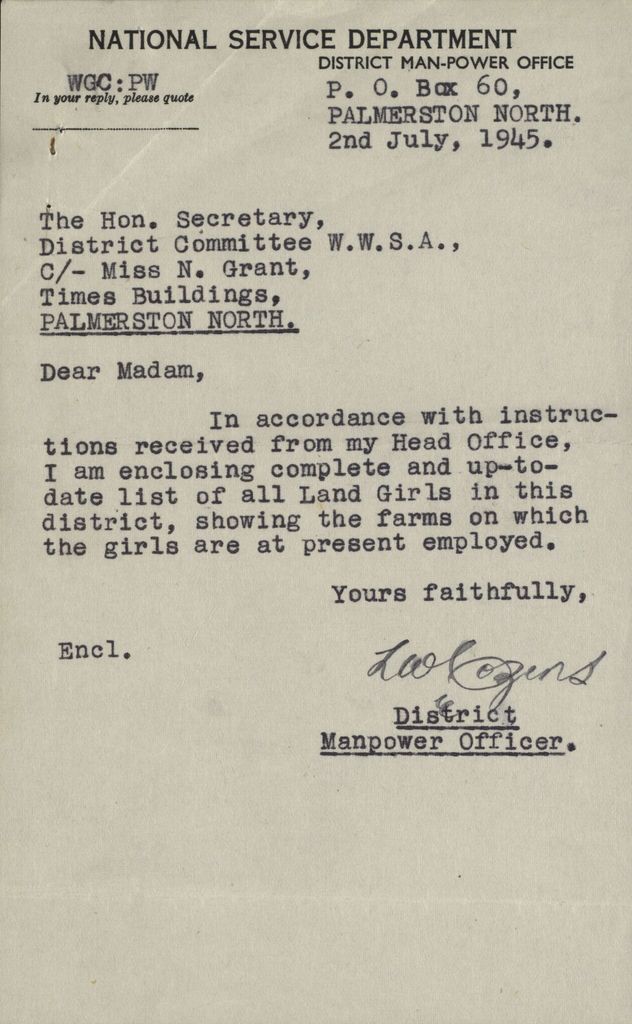 Correspondence: Letter advising of an attached list of the the land girls in the district.