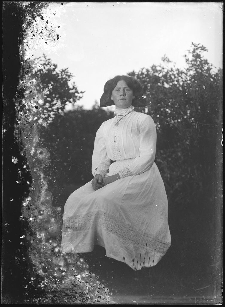 This photograph was created by William James Young in the early 20th century. A large variety of subjects are depicted in the collection, but family, rural life and travel are the most prominent themes. The exact location of the photographs in the Young Collection is unknown, but W J Young lived on a farm in Mt Stewart, Rangitikei, and some of the photographs include his house. The Young family were apparently avid travellers and photographs later in the collection feature scenes from Rotorua, Auckland, Whanganui, as well as other unidentified locations. The portraits are all unidentified, but are presumably of members of the Young family. The photographers parents were George Henry (b 1833) and Jane McDowell (b 1842, d 1916). They came to New Zealand in 1877. The same year, they bought the home farm on Mt Stewart and called it Kilrudden after Kilrudden House, the home of the McDowell family in Ireland. The couple had four children: Ann (b 1873), Margaret (b 1876), John (b 1878) and William James (b 1880). William James married Mary Elizabeth Thompson and they had four children: Doris (b 1914, d 1989), George (b 1916, d 1991), Royden McDowell (b 1925, d 1992) and Noel William (b 1927, d 2013).