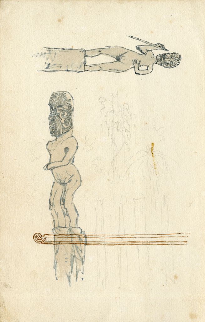 Drawings of two Māori carvings. There are also some faint pencil markings that may indicate that this drawing was not completed. The drawings are in pencil, ink and water colour. Drawn on paper measuring 20.5 x 13 cm. While the artist is unknown, they were gifted to the donor by the son of J. T. Stewart, Government Surveyor.
