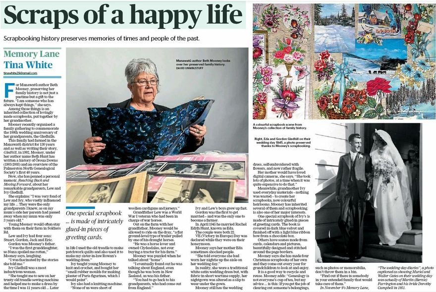 Journalist Tina White's weekly "Memory Lane" article in the Manawatū Standard. Author Beth Mooney retains her grandmother's scrapbooks and creates new scrapbooks about the history of the Gledhill family, who have farmed in the Manawatū district for 130 years.