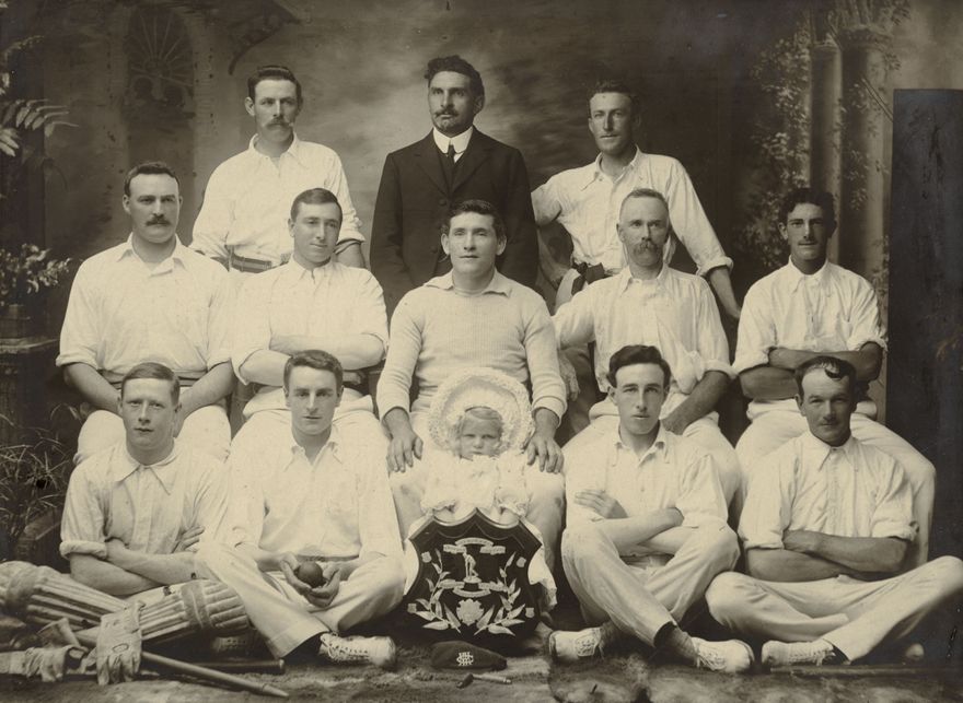 Winners of Manawatu Cricket Association's Wednesday shield, 1907-8, 1908-9. Back Row: E . Johansen, Mr J.A. Nash (Patron), G. Isaacs. Middle Row: W.H. Overton, W.P. Henderson, E. M. Goldspring (Capt.), J.A. McLeavey, A. Fenton. Front Row: W.S. Kaye, C. Turner, R.E. Cuthbertson, H.R. Cornford.