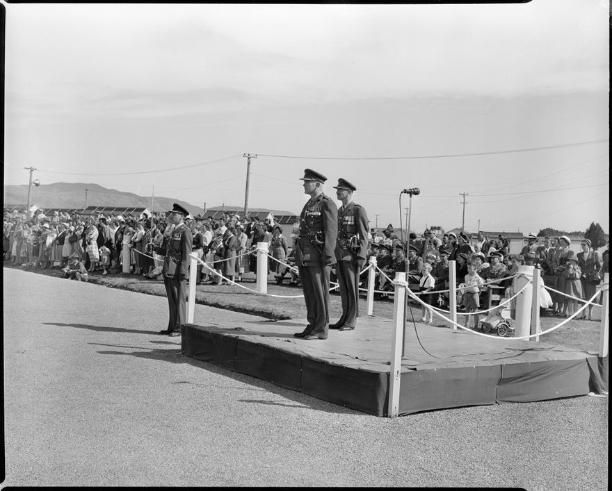 Two senior officers wearing medals stand on a raised platform at the Linton Army Camp, a third officer stands to one side and a large group of civilian spectators stand behind them. This negative comes from the Elmar Collection - a large series of semi-identified and unidentified images from the 1930s-1970s.