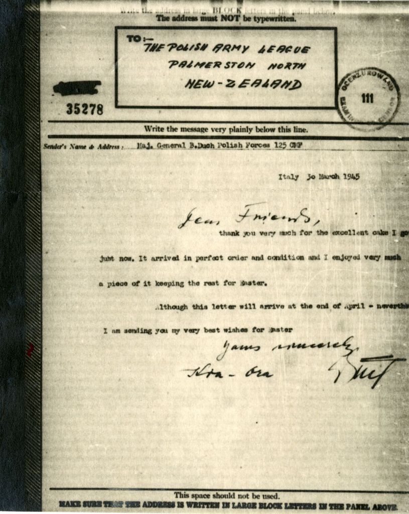Letter from a Polish soldier to the Polish Army League, thanking them for the parcel he received from them. The Polish Army League, founded in Palmerston North in WWII, corresponded with and sent parcels to Polish soldiers who served with the allies in World War Two.