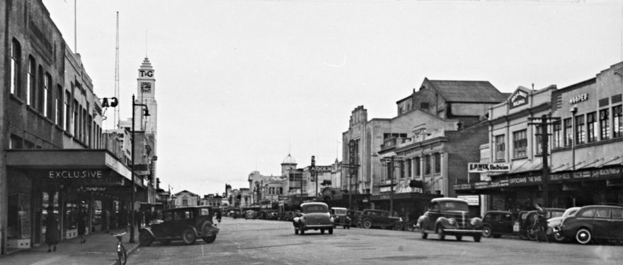 Broadway Avenue, originally Broad Street, Palmerston North, was renamed, at the instigation of G H Bennett, bookseller, and other retailers, by Borough Council resolution in March 1926. The T and G Building, seen to the left was completed in 1937 and the Regent Theatre, to the right, was built 1929.