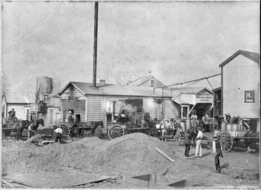 This wooden factory was replaced by a brick building in 1911, so the excavations in the foreground may be the foundations of the new factory. The Rongotea Co-op Dairy Co. Ltd was established in 1895 and was amalgamated in 1960 with the Awahuri Co-operative Dairy Co. Ltd, to form the Manawatu Co-operative Dairy Co. Ltd.