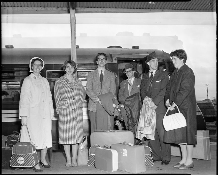 This image was taken for a story that ran in The Manawatu Evening Standard on 06 September 1960 "Four trainee graduates in science and mathematics for the Freyberg High School and two permanent appointees, one for the Girls' High School and the other for the Boys' High School, arrived in Palmerston North this morning. Photographed on arrival at the station they were (from the left): Miss A.C. Oliver (Edinburgh), Mr. P. Cromer (Lancashire), Mr. M.S. Brown (Edinburgh), for the Boys' High School ; Mr. A.G.L. Edwardson (Cheshire); and Miss E. Molesworth (Devon), for Girls' High School."